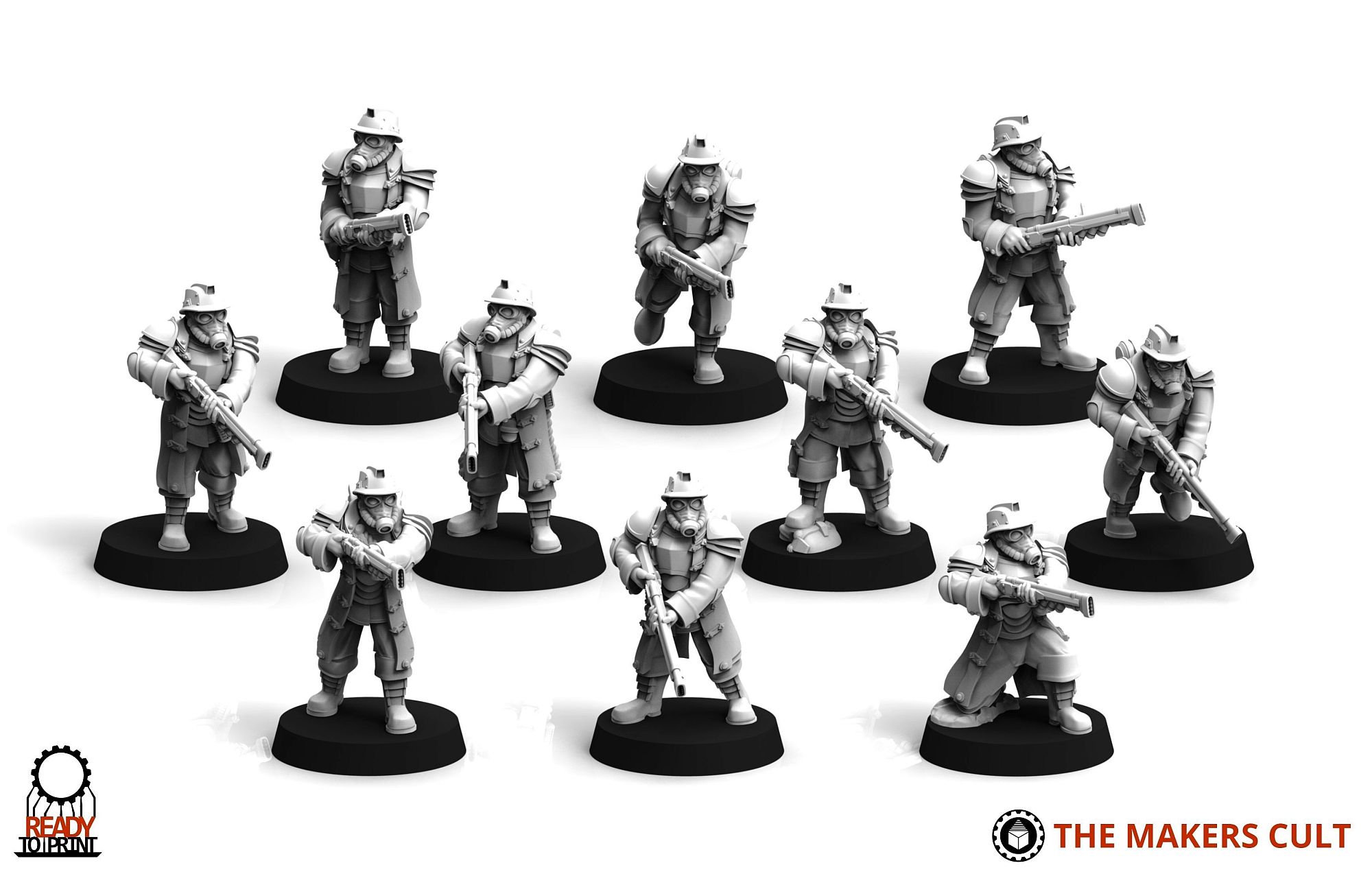 The Primus Scion Recruits is a multi-part kit that allows you to build a squad of recruits. It comes with optional heads in two styles, various rifle arms and 10 body poses that can be mirrored for another 10.