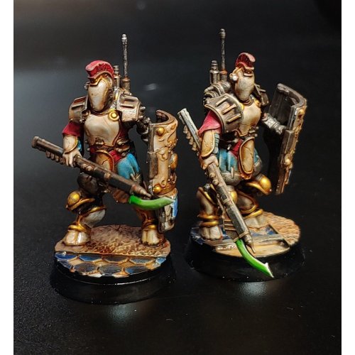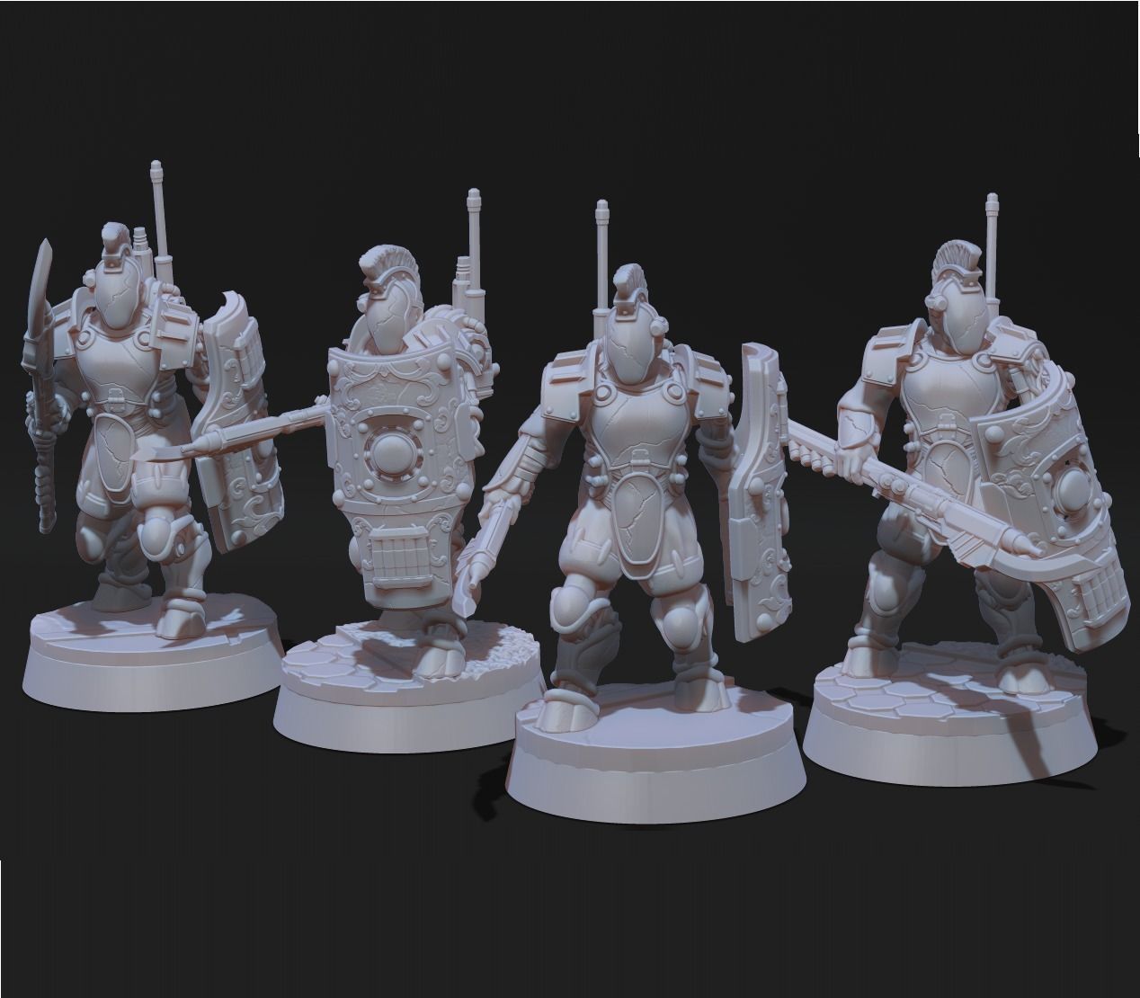 This is a multipart kit made to build a squad for Fabricarii Testudo troops. The kit comes with 10 bodies, 10 basetoppers, and 9 uniquely posed head socket is cross compatible with other Fabricarii, Cyberzerker and Jade Coalition troops, so feel free to mix and match.