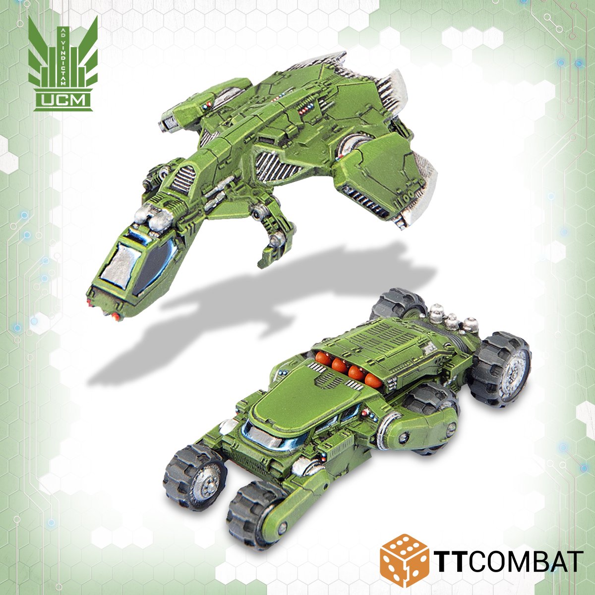 This box contains a perfect small UCM army. With 6 tank-hunting Sabres, 6 anti-air Rapiers, and 12 bases of Legionnaires all in Bear APCs, you have a solid core for an army. All of these are brought to battle in 6 of the ubiquitous Condor Dropships, which provide astounding speed and survivability.