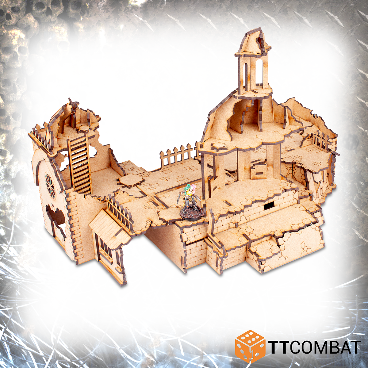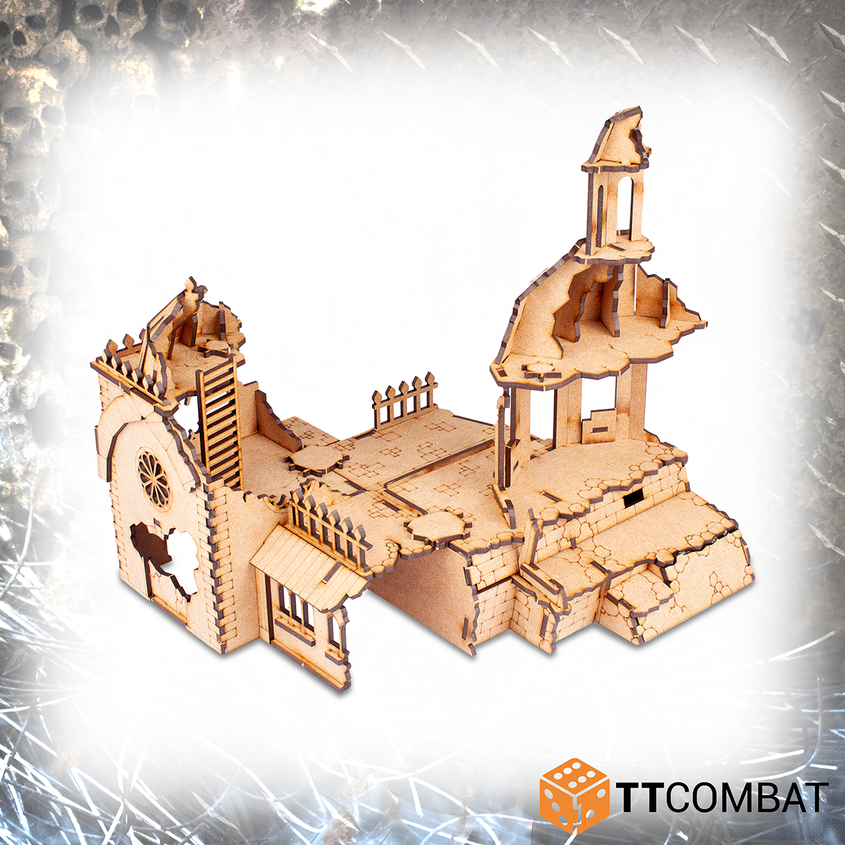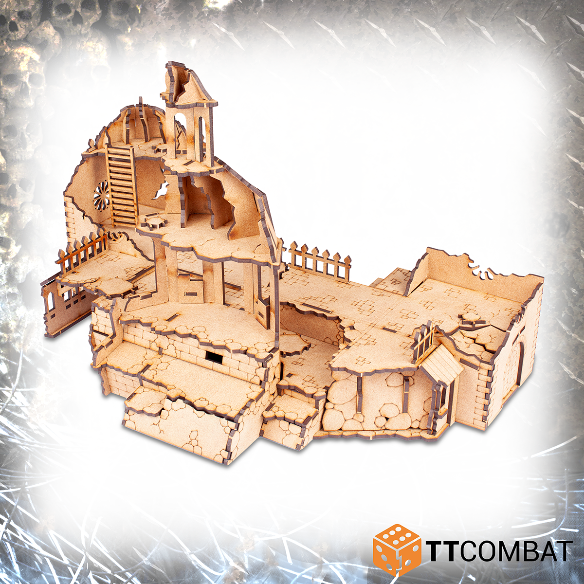 All the Convent kits are designed to be used together in many different ways. Even though this kit is ruined it can be used apart or together and can connect to existing buildings in the range. In this way you can make sprawling connected buildings to hide behind or occupy, and then take them apart again for easy storage after the game is over.