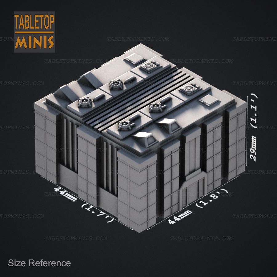 6mm sci-fi buildings heavily inspired by classic cardboard cutouts from popular mech-based tabletop games. Suitable for use in 6mm scale wargaming, including mech combat and other science fiction scenarios.