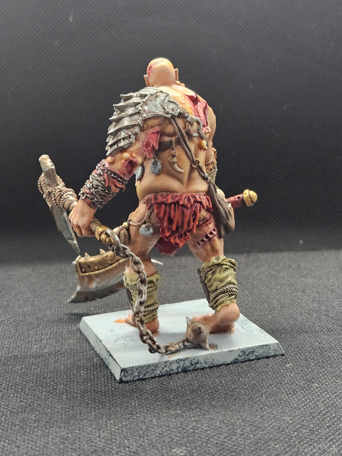 A distinctive feature of Grothak is the sack he carries at his side, filled with the skulls of slain foes, testament to his fierce dominance on the battlefield.