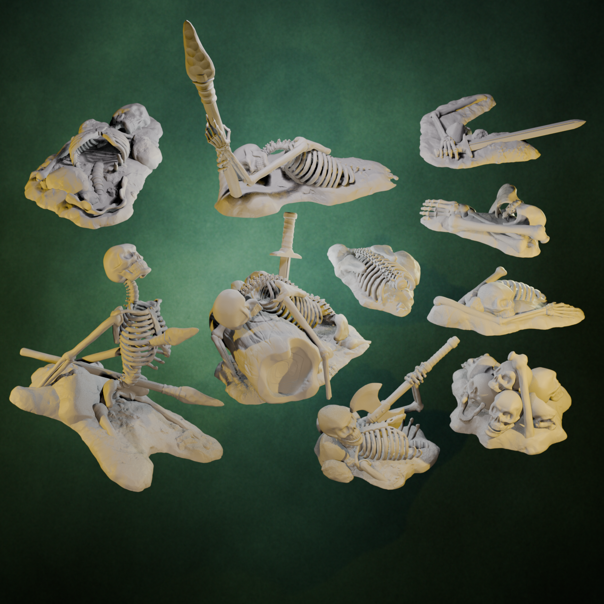Add realism to your bases and terrains with the remains of long forgotten battles in a shape of 10 unique skeletal remains. Inside the package, you'll find 10 different models, both supported and unsupported, of long-dead victims of war.