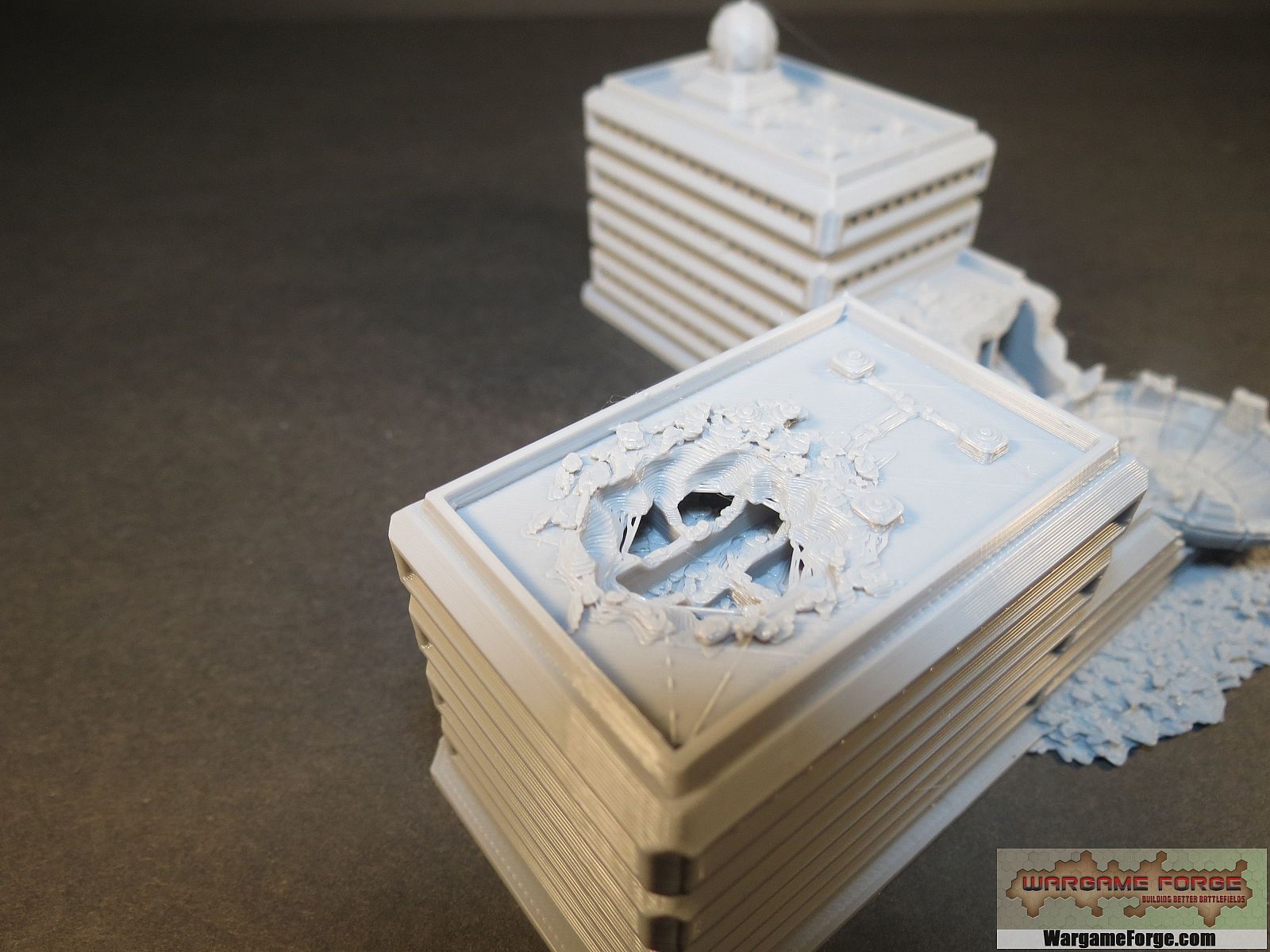 When I print any building from my "Ruined" line I do not print with supports. I try to design in a way that they are not needed. But due to the amount of overhanging parts there will be strands of PLA filament hanging down. I have come to like this look and think it adds to the ruined look, cables and stuff hanging down from the ceilings. I do try and remove the obvious strands. If you do not like the look for want to reduce the strands they are easily removed with a pair of needle nose pliers or tweezers or even your fingers if you have small hands. You may print with supports if you wish to avoid this. But I have not printed with supports.