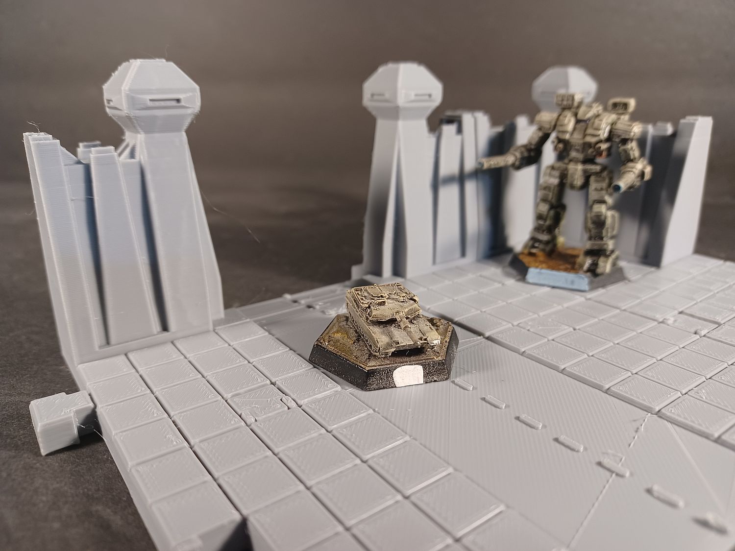 Any mechs or buildings shown in the pics are shown for scale reference and are not included. The pic with painted terrain shows an example of a completed walled city board and includes tiles from the main City Tile set sold separately.