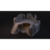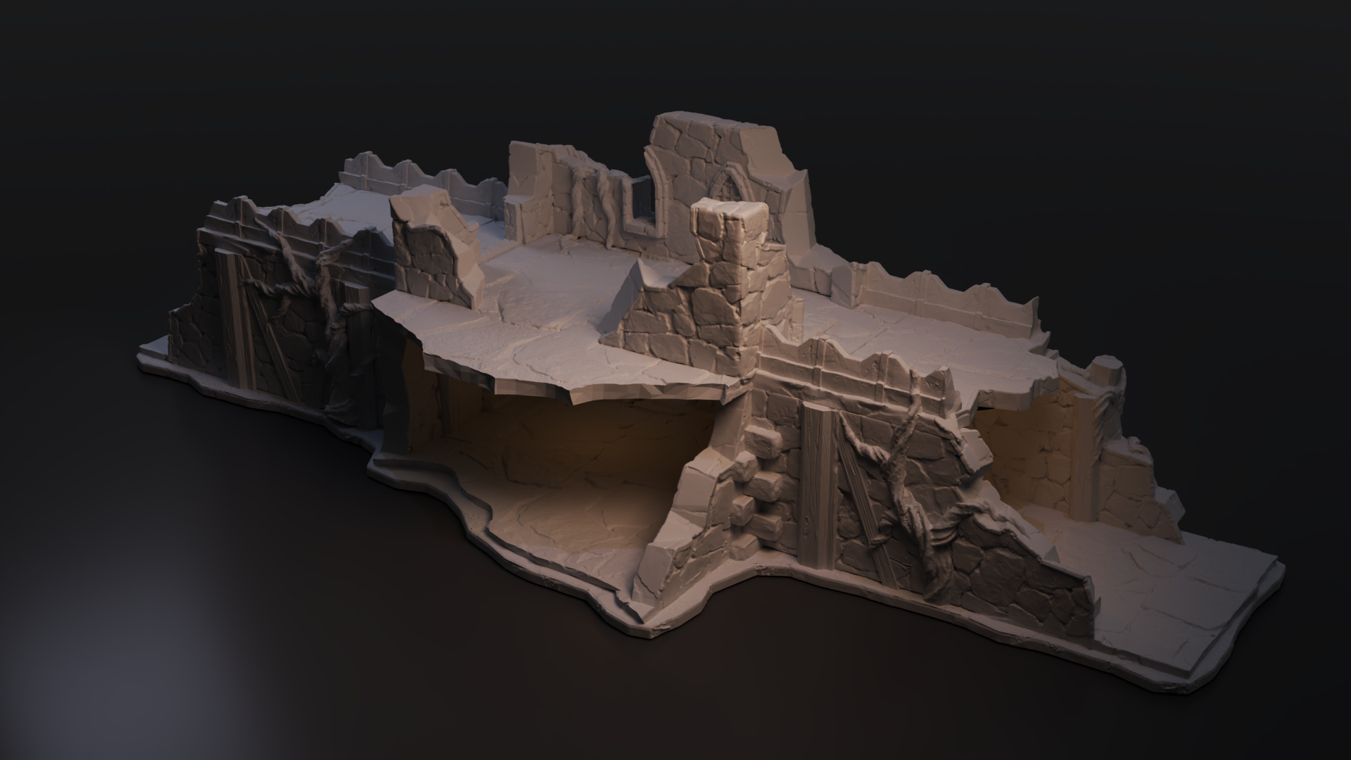 The first building consists of 6 files, the second one consists of 4. The buildings are designed as fortress structures, with massive stone walls and wooden supports. Their upper sections are partially destroyed, creating jagged edges. Signs of destruction are visible everywhere—cracks, debris, and roots.