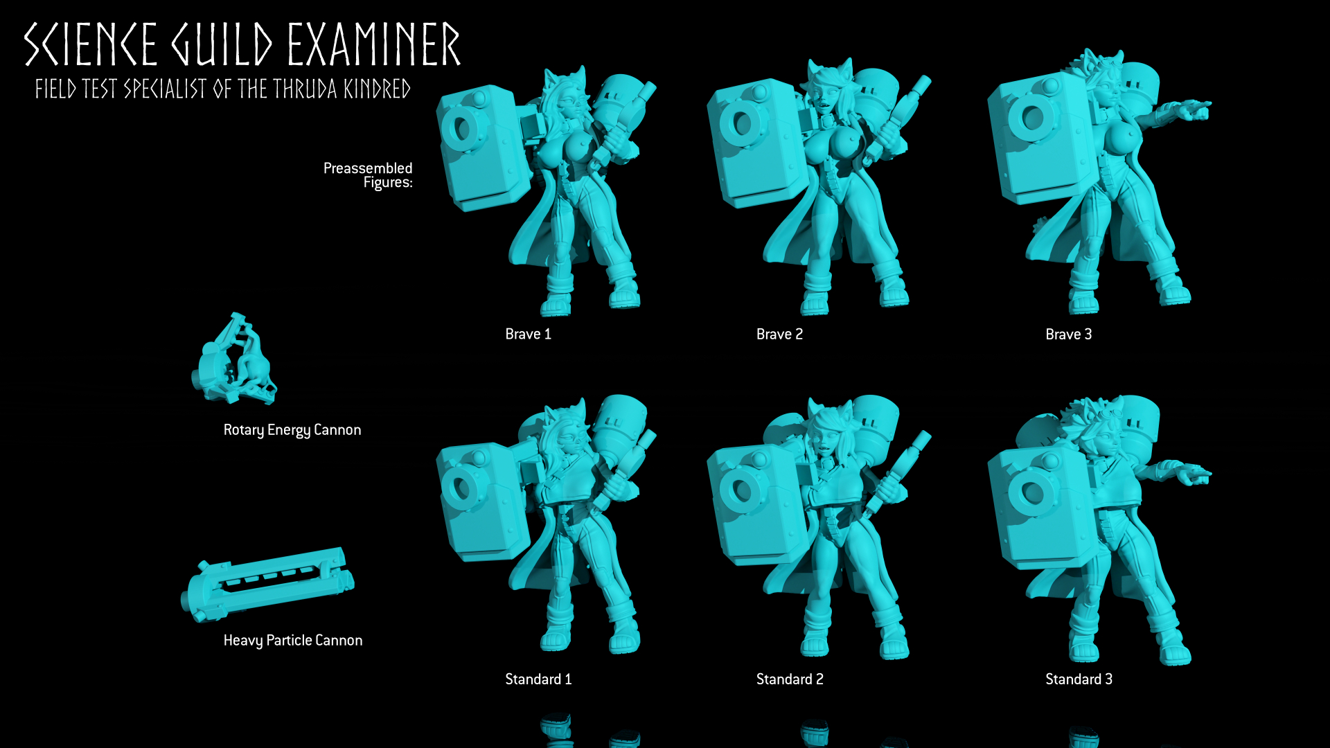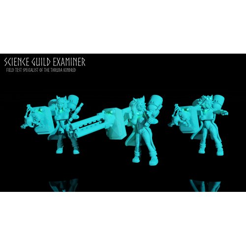 The Thruda Kindred are ever prevalent, a caste of engineers and researchers furthering Idunni's knowledge and crafting the advanced weapons and wargear utilized throughout the Idunni Consortium. Among these, the Science Guilds are renown for their extensive exploration and research to advance everything from weapons of war to simple domestic goods. While many that would develop advancements in military technology are more than happy to let others brave their practical testing, some quite eager and dutiful examiners join the various kinhosts in order to tweak and perfect their unique weapons in far more practical applications. Either armed with a wildly experimental and dangerous Heavy Particle Cannon or the thunderous Rotary Energy Cannon, these Examiners can provide exceptional firepower to the warbands of the Idunni Consortium.