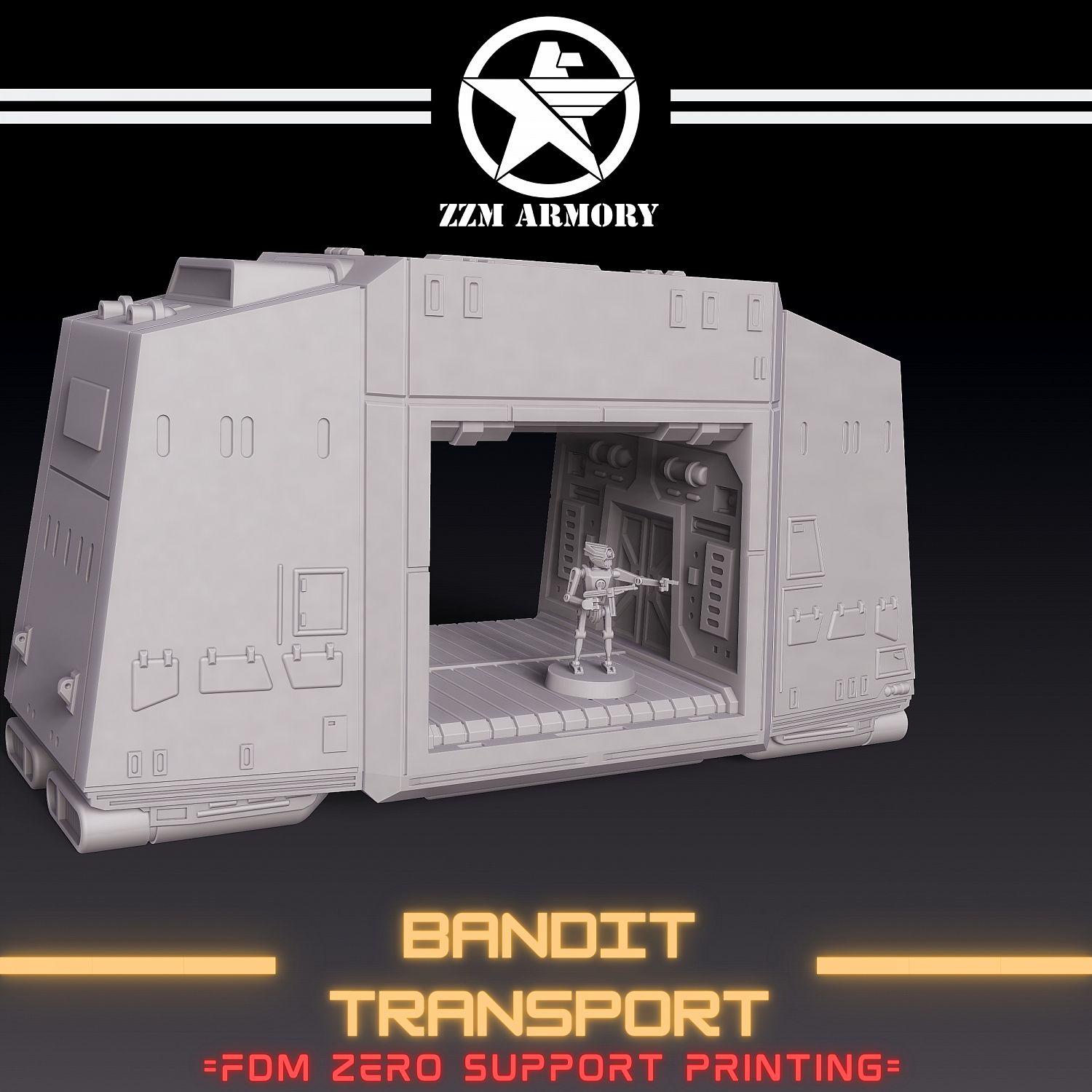= SW LEGION INFO =As all ZZM ARMORY models are made with a Legion table in mind here are a few stats and tips on how to use this model! This beast clocks in under Height 1 to take full effect of Jump 1 on the battlefield. The Open Transport Mode makes for a very dynamic piece of terrain that allows for better sight lines then the average blocky terrain without being overly complicated to declare line of sight through!